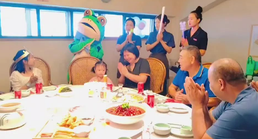 餐中,網(wǎng)紅青蛙給壽星唱了生日快樂歌,