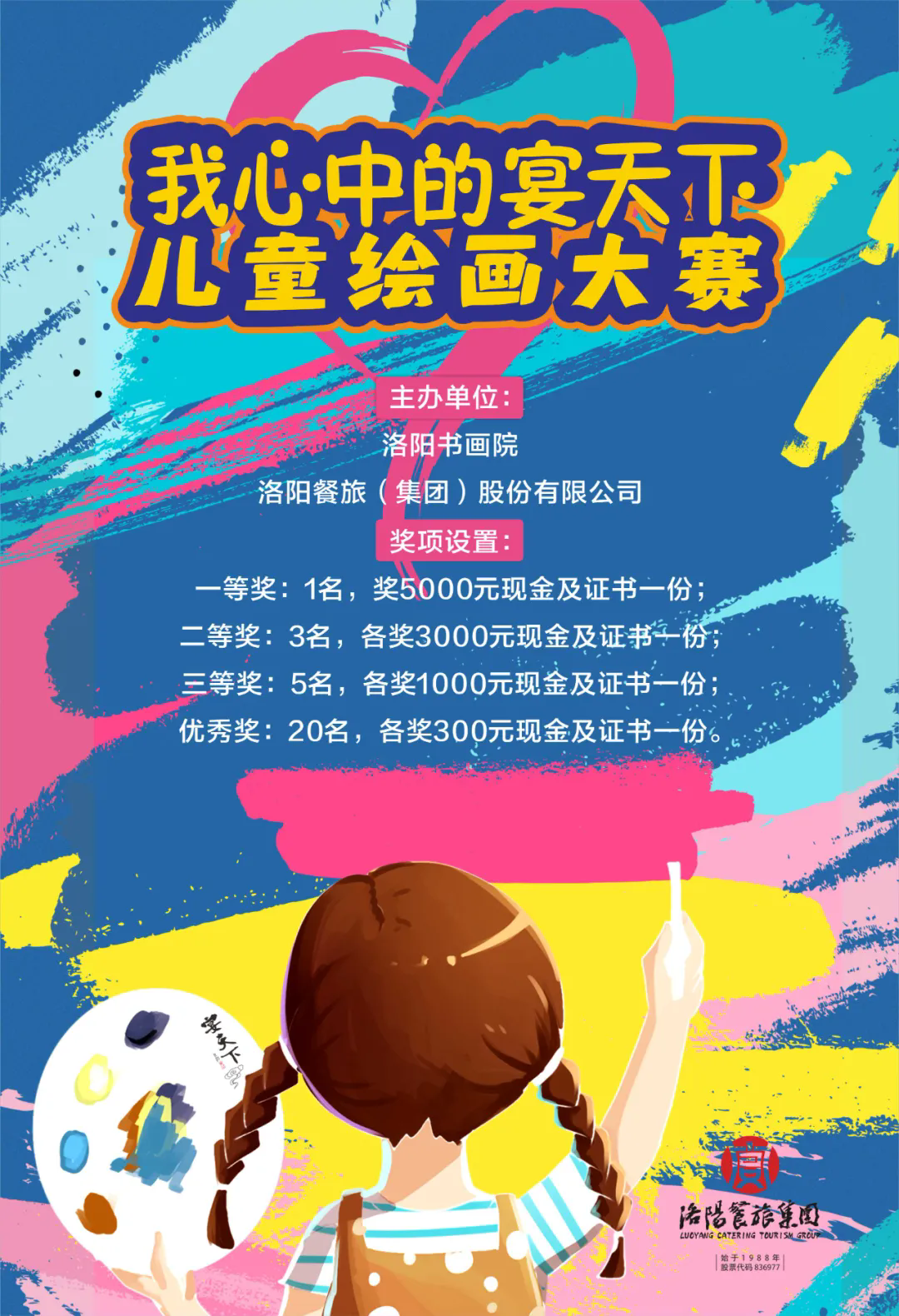 為了發(fā)現和培養(yǎng)廣大兒童繪畫愛好者,弘揚河洛文化精髓,同時使少年兒童更深刻地了解河南老字號“宴天下”品牌厚重的歷史底蘊、不凡的發(fā)展歷程和遠大的發(fā)展前景,進一步增強“宴天下”品牌的社會影響力,推動洛陽餐飲知名品牌高質量發(fā)展,洛陽書畫院、洛陽餐旅(集團)股份有限公司決定于6月8日至7月8日聯合舉辦《我心中的“宴天下”》兒童繪畫大賽。